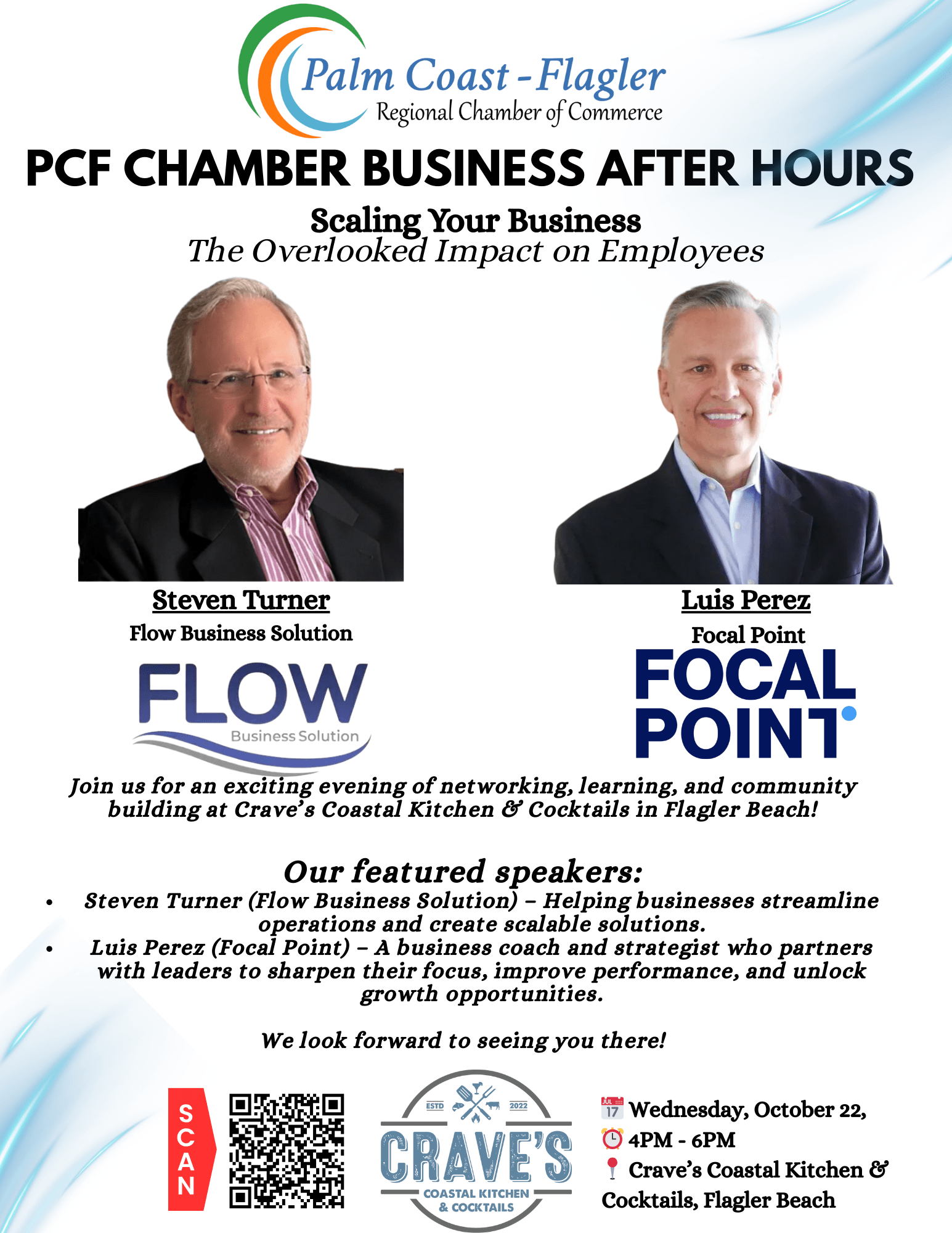 Join us for an exciting evening of networking, learning, and community building at Crave’s Coastal Kitchen & Cocktails in Flagler Beach! Our featured speakers: Steven Turner (Flow Business Solution) – Helping businesses streamline operations and create scalable solutions. Luis Perez (Focal Point) – A business coach and strategist who partners with leaders to sharpen their focus, improve performance, and unlock growth opportunities. We look forward to seeing you there!Images
